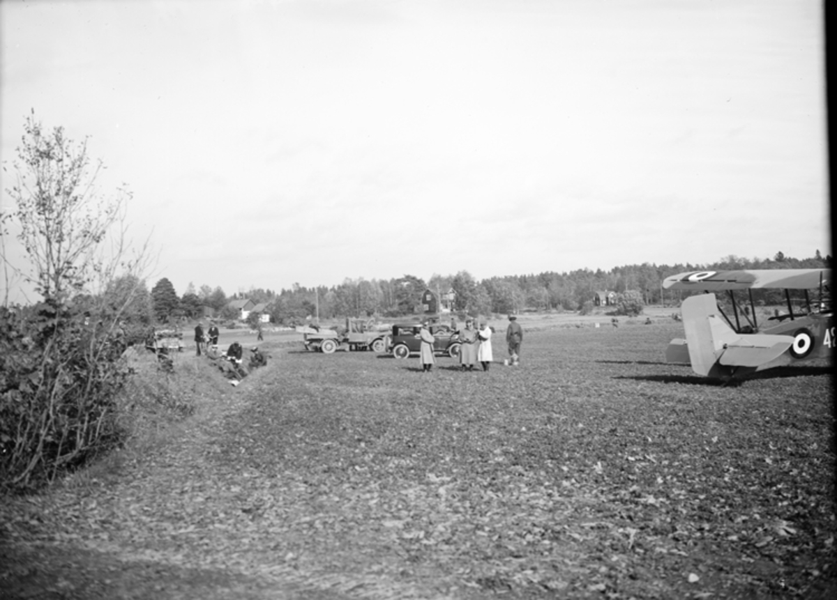 Människor, bilar och fiendemärkta flygplan S 1 på ett fält.