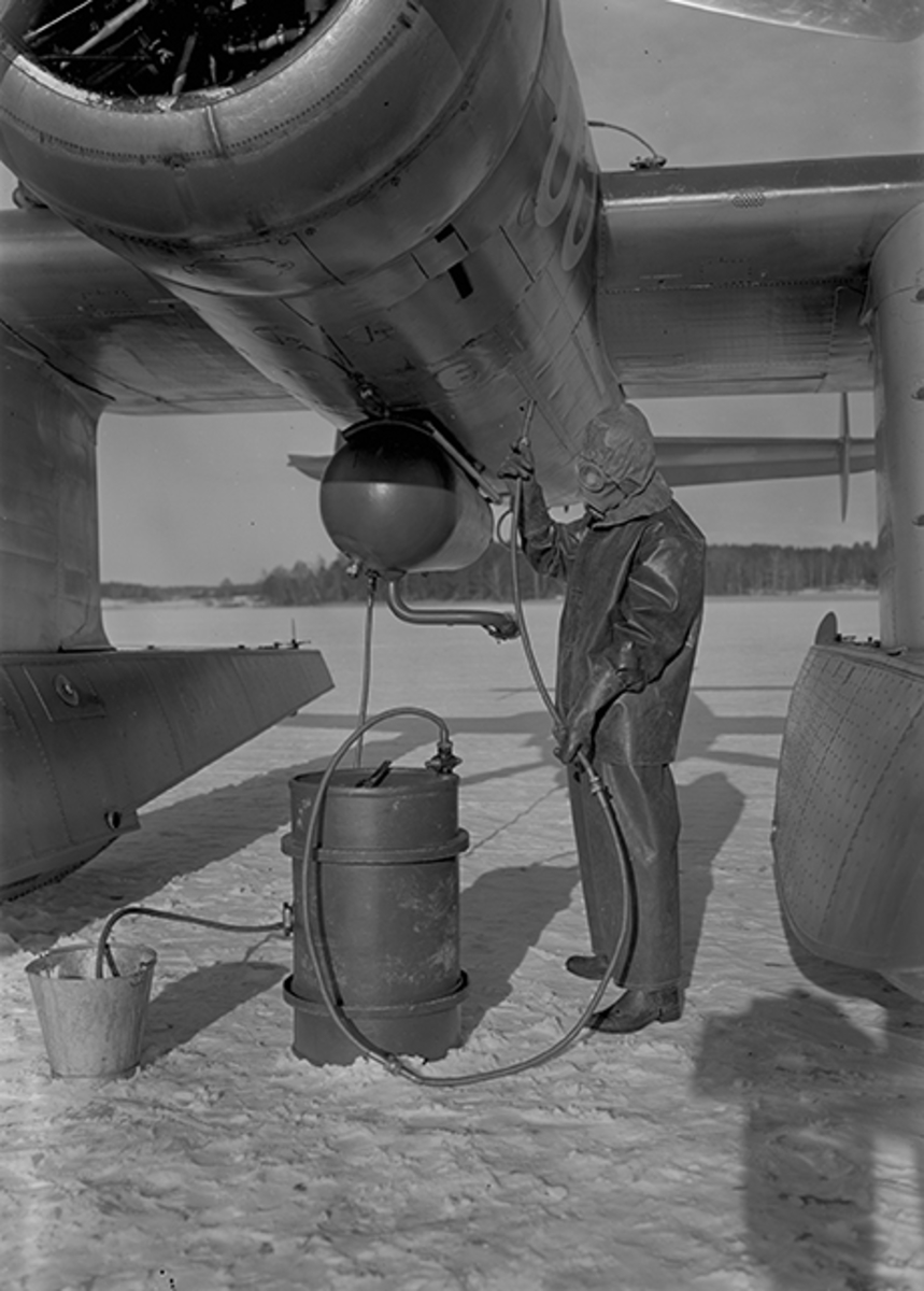 Påfyllning av dimbildare på flygplan S 17. Slang ansluts till flygplanet.
