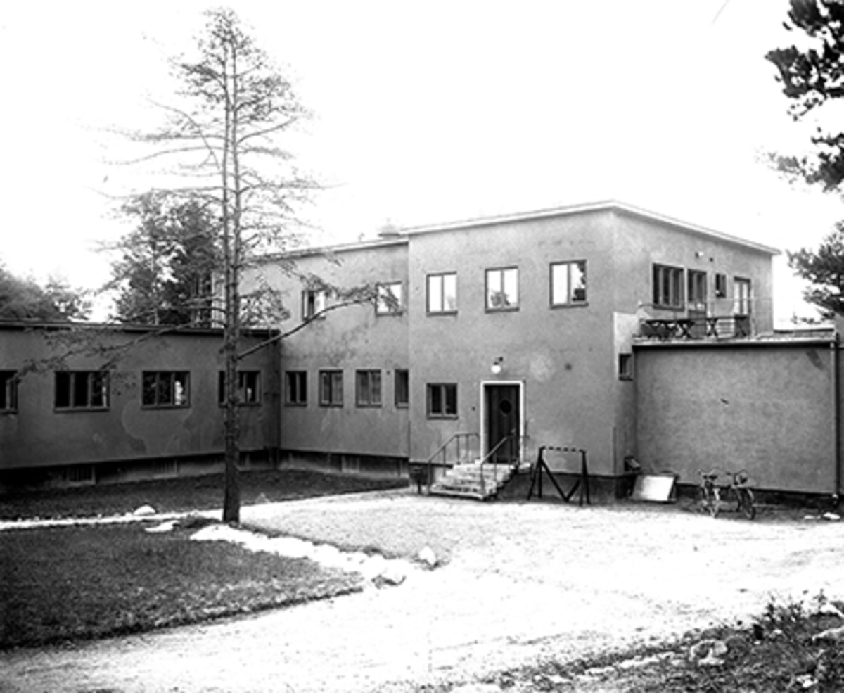 Ingång till sjukvårdsavdelningens byggnad på F 2 Roslagens flygflottilj. Exteriör.