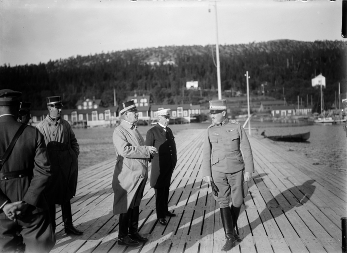 Fem män på en brygga. Tredje från vänster: general Carl Gustaf Hammarsköld, Gustaf Åkerman samt Karl Amundson.
