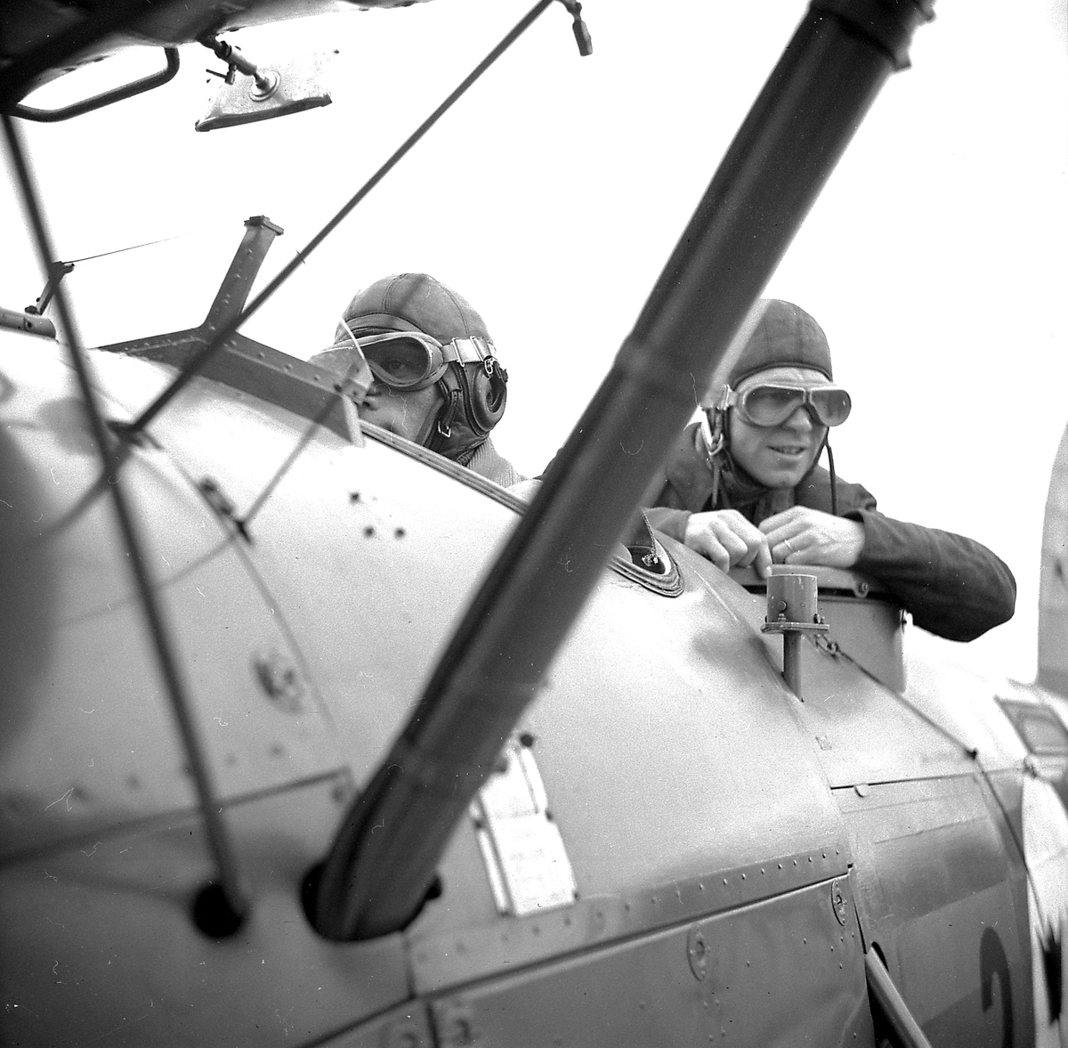 Två flygare ombord på flygplan S 9. Närbild av förarplats framifrån.
