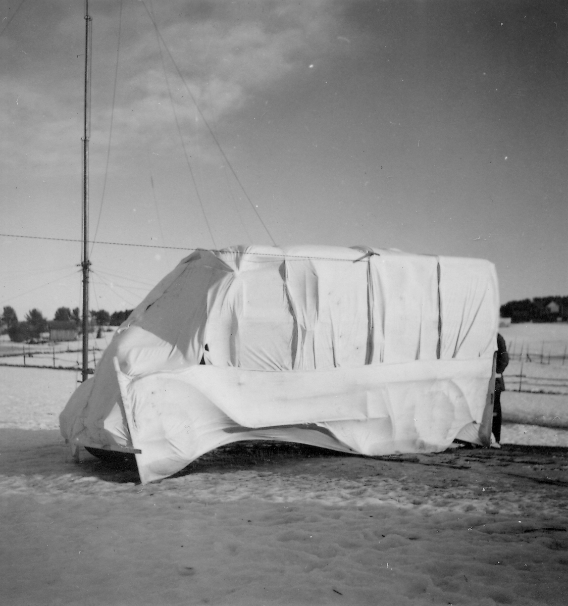 Kamouflerad transportabel markradio, TMR, vid Delsbomanövern, 1938. Närbild av radiobil.