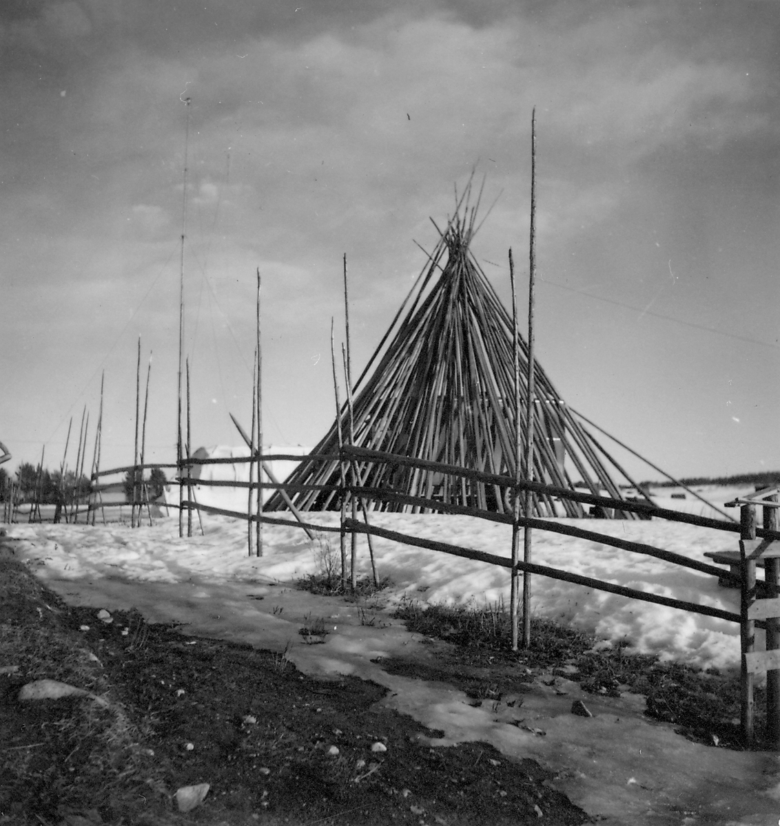 Kamouflerad transportabel markradio, TMR, vid Delsbomanövern, 1938. Översikt av hydda.