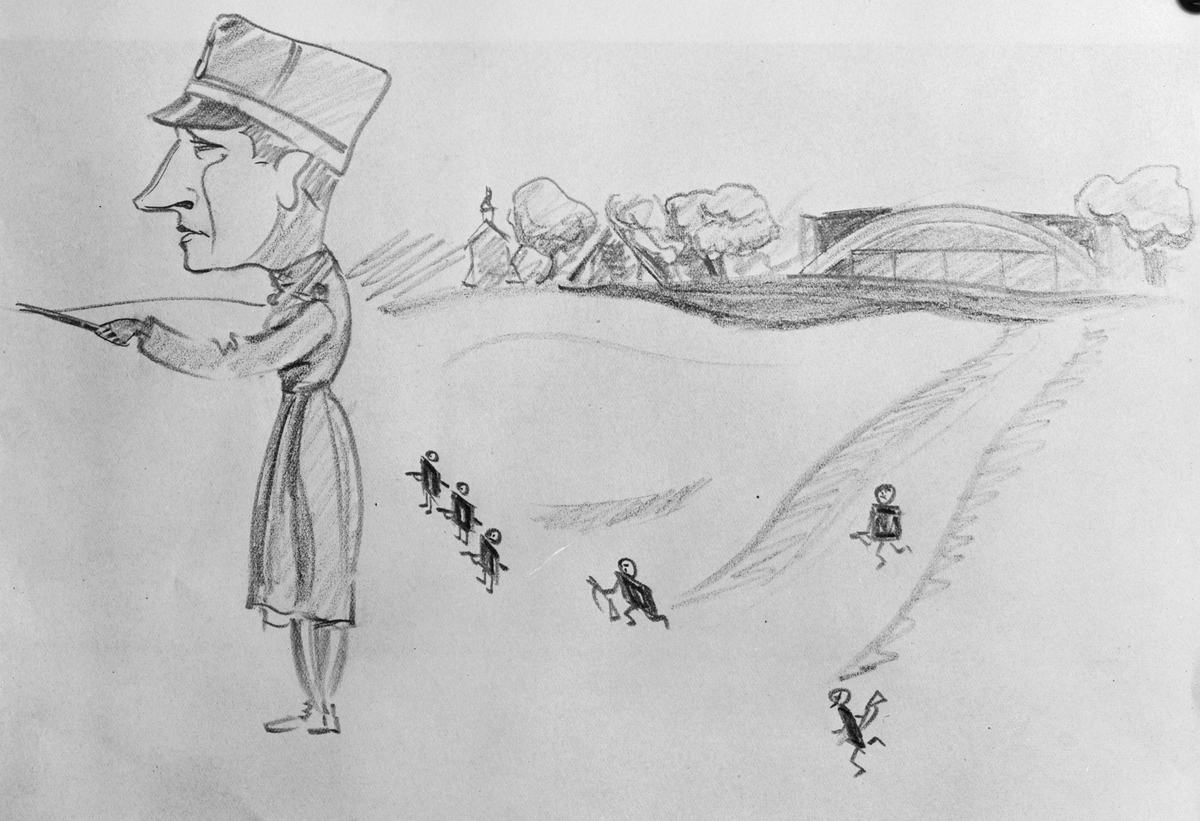 Karikatyrteckning av löjtnant Lindskog ur flygvapnet vid F 3 Malmen. Avfotograferad teckning.