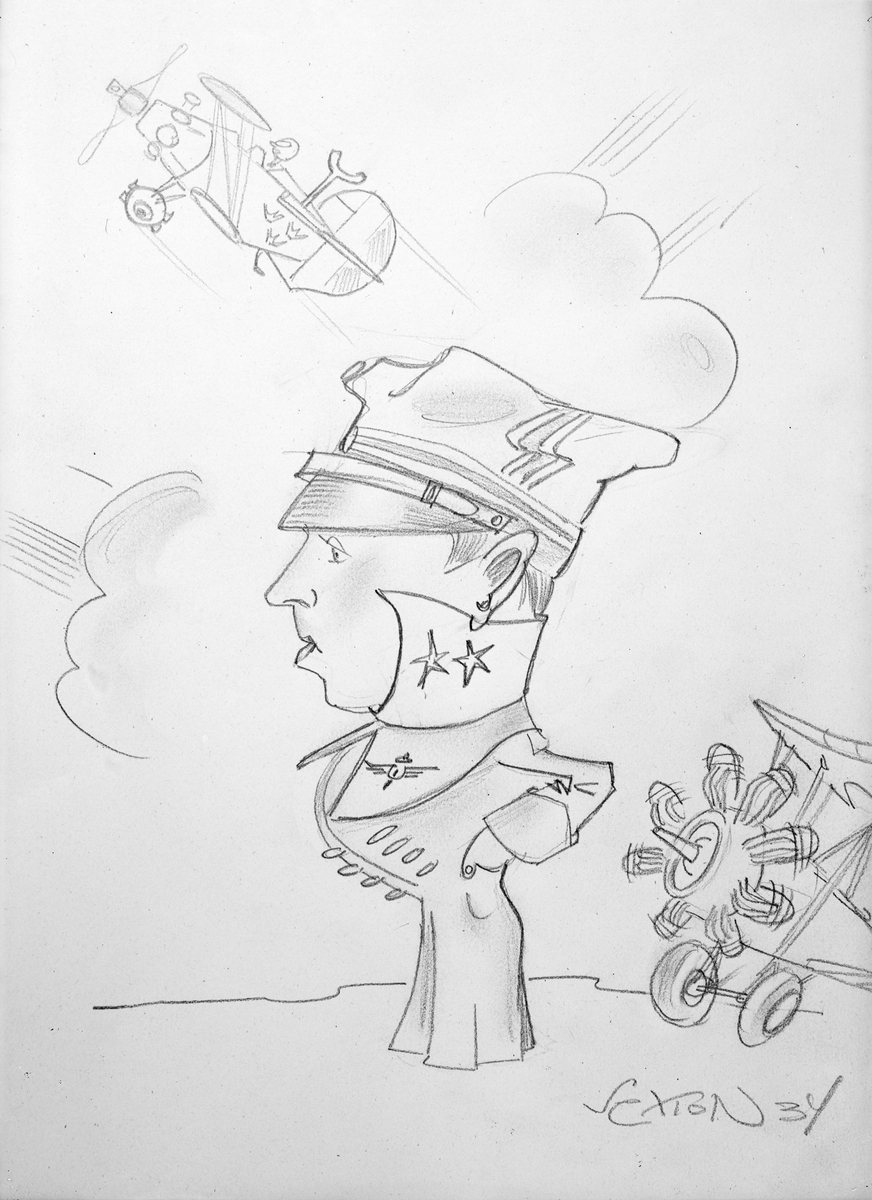 Karikatyrbild av löjtnant Ripa ur flygvapnet vid F 3 Malmen. Avfotograferad teckning.