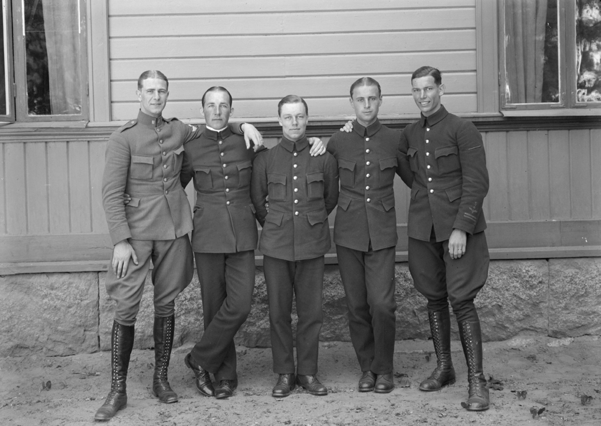 Grupporträtt. Arméspaningskurs på F 3 Malmen 1932. Fem officerare framför ett hus.