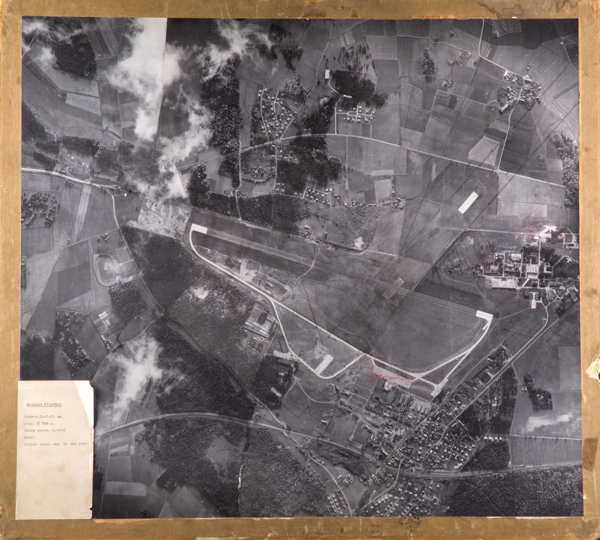 Flygfotografi av Malmens flygfält från 2500 meters höjd, år 1950. Monterat foto.