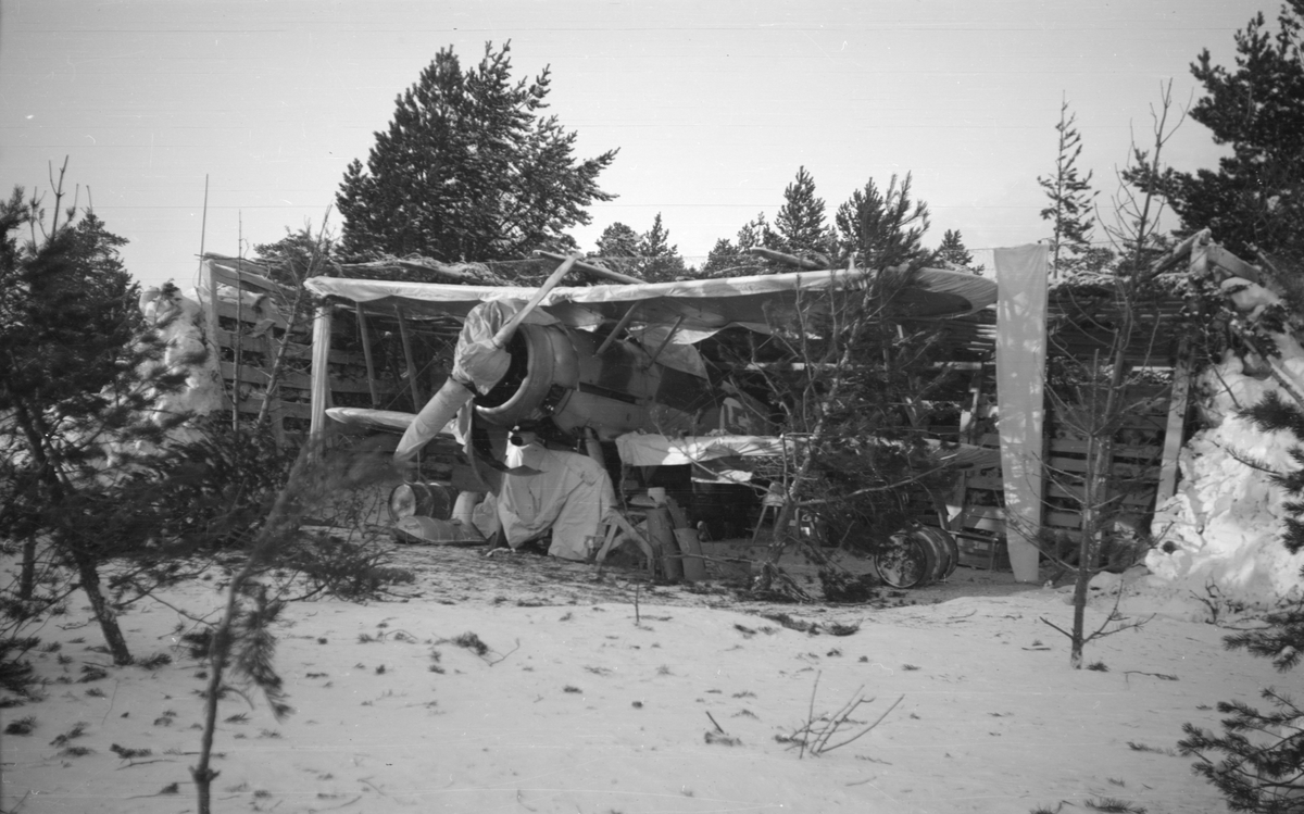 Flygplan Gloster Gladiator märkt gul A iklädd kapell och tillhörande F 19, Svenska frivilligkåren i Finland, står i ett värn. Vy snett framifrån.