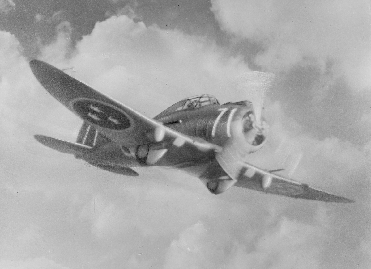 Jaktflygplan J 9 märkt nummer 71 från F 8 Barkarby i luften.