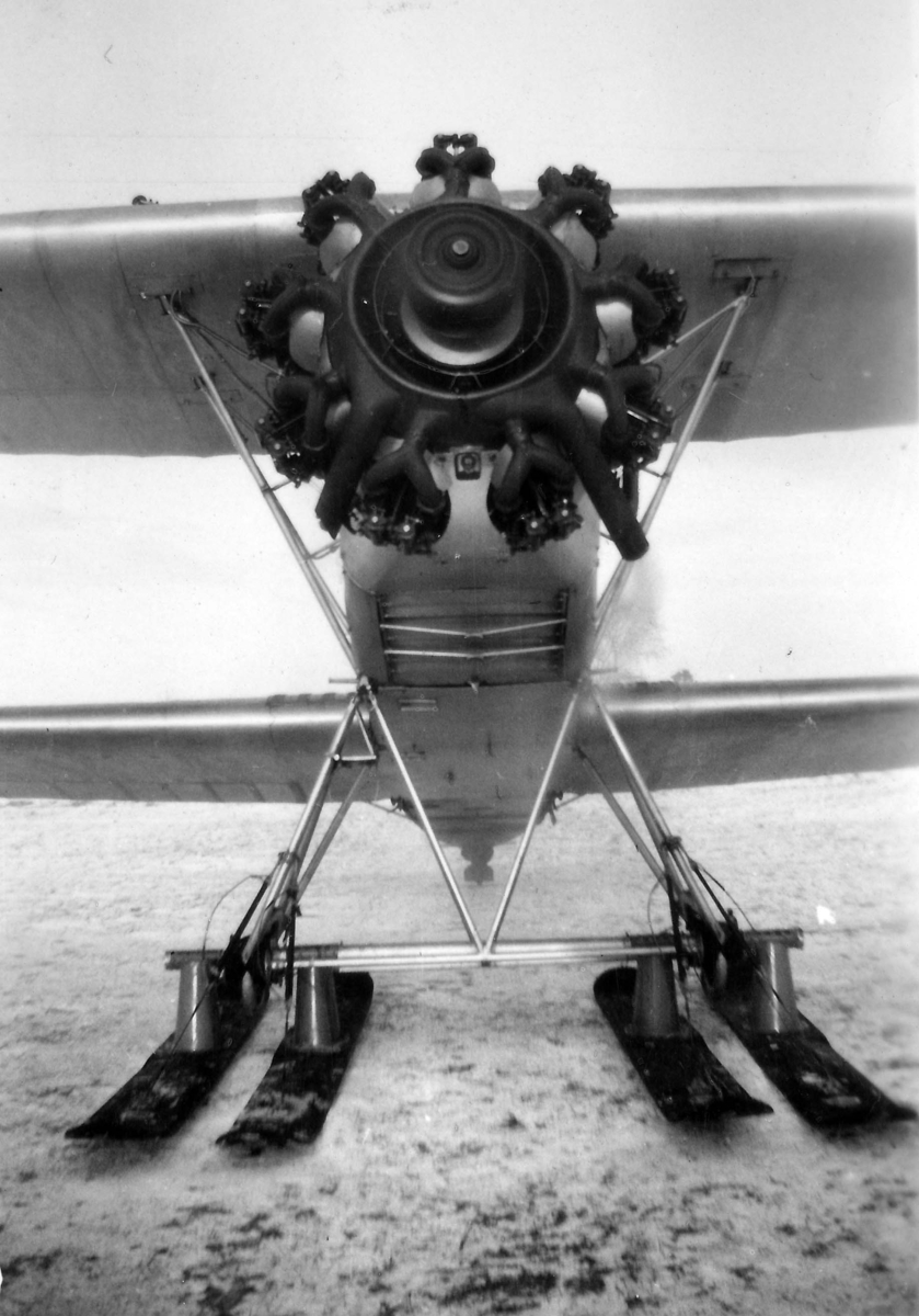 Närbild av nosdel och motor på flygplan S 6 på skidor, vintertid. Vy framifrån. 1930-tal.