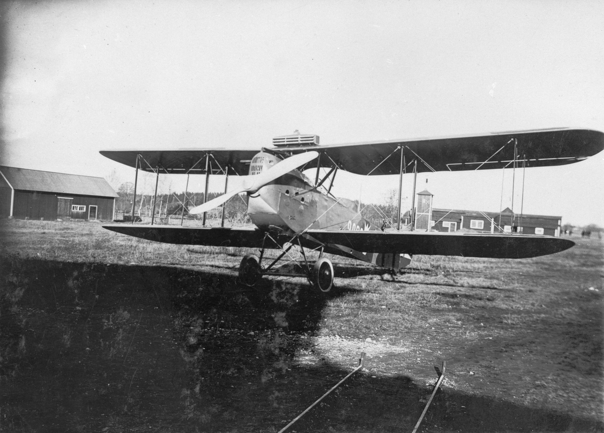 Flygplan FVM S 21 uppställt på ett fält, omkring 1922-1926. I bakgrunden syns en tranformator och ett stall.