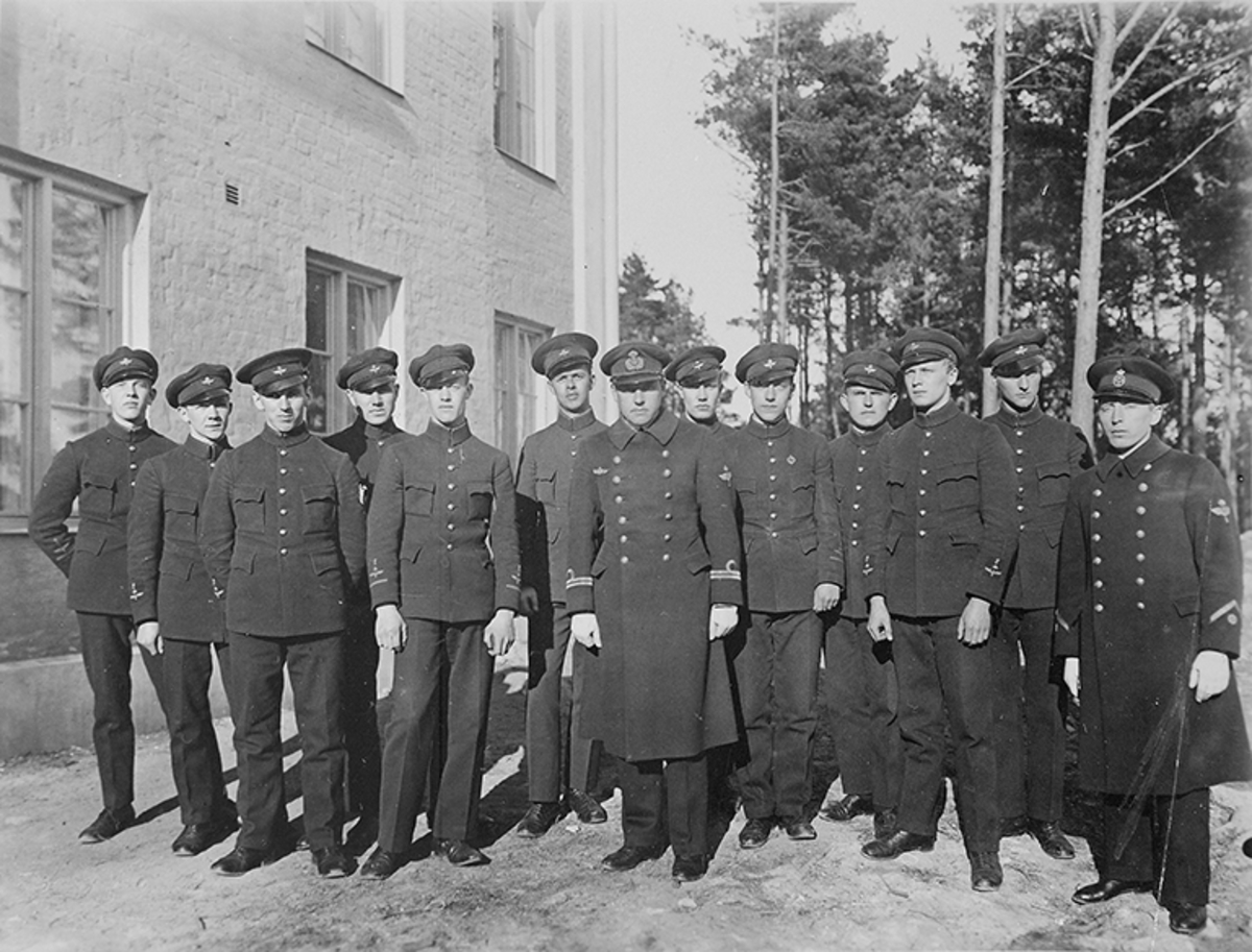 Grupporträtt av officerare ur flygvapnet och marinen bredvid byggnad på F 2.