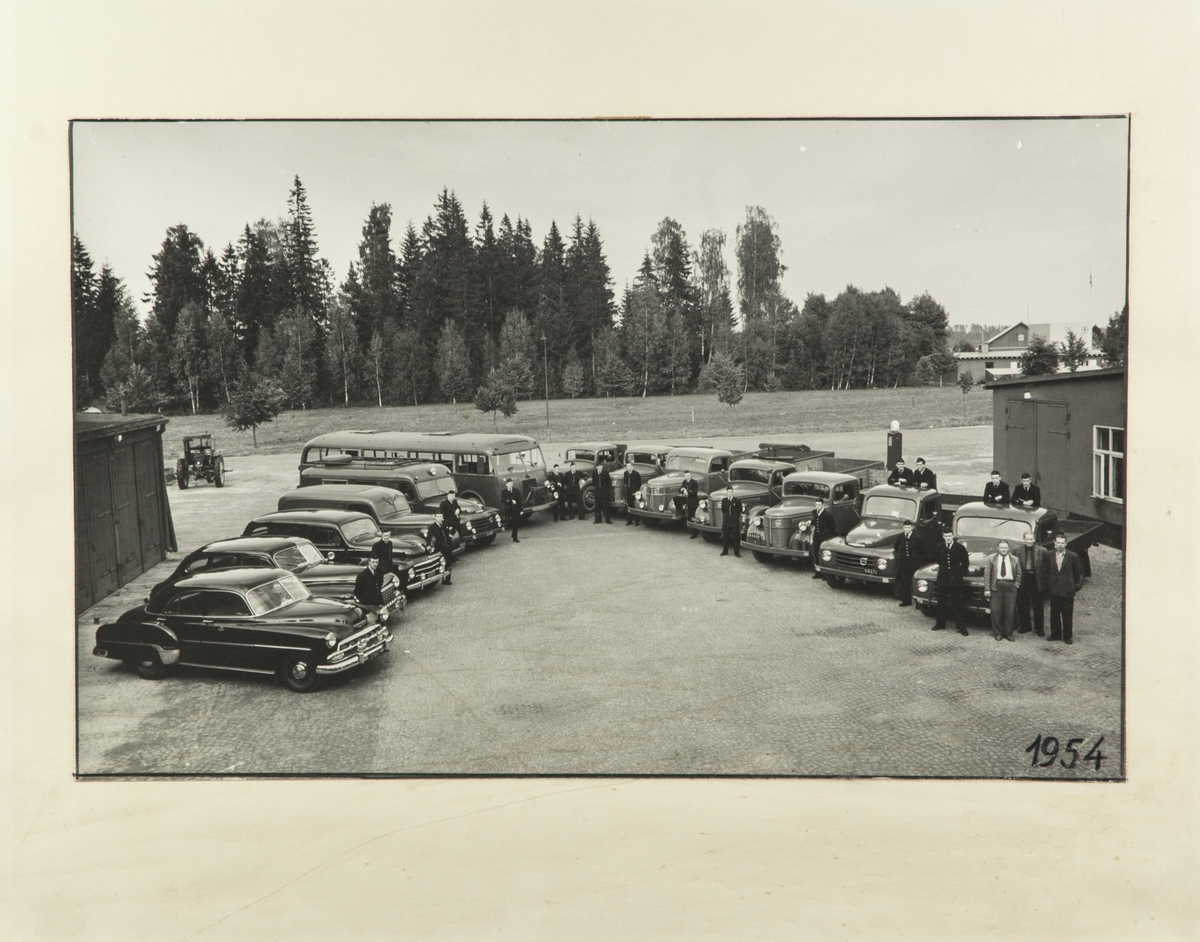 Uppställning av militära bilar, lastbilar och bussar år 1954. Militärer och förare vid fordonen.