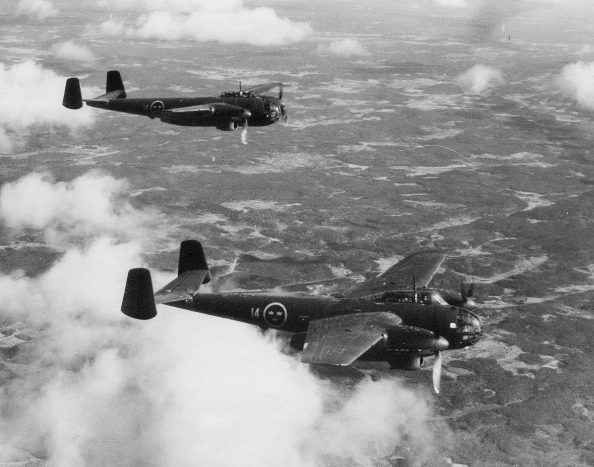 Två flygplan B 18 flyger i formation. Roteflygning.