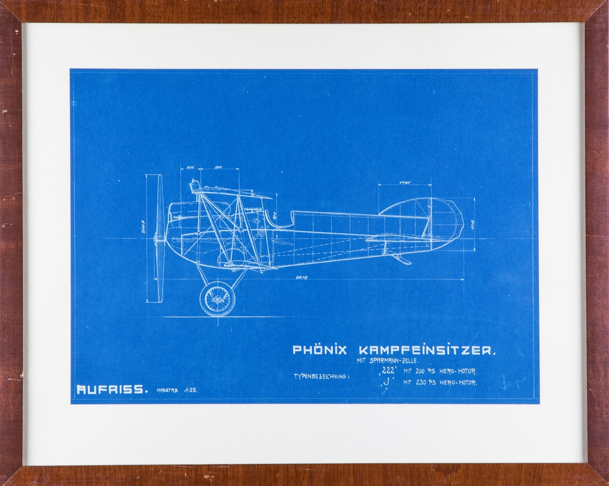 Planritning av flygplan Phönix Kampfeinsitzer mit Sparmann-Zelle. Vy från sidan. Inramad reproduktion.
