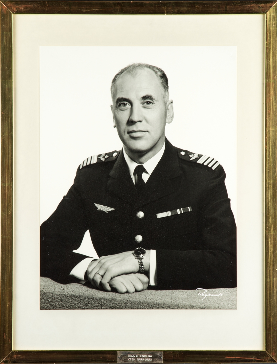 Porträttfotografi av Dick Stenberg, chef för F 18 Södertörns flygflottilj 1963-1966. Inramat foto.