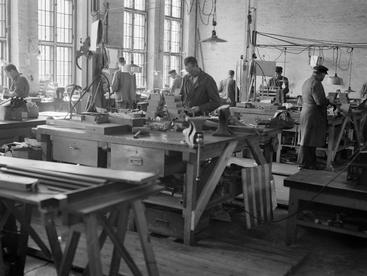 Interiör av verkstad på Centrala flygverkstaden i Malmslätt. Hantverkare i arbete.