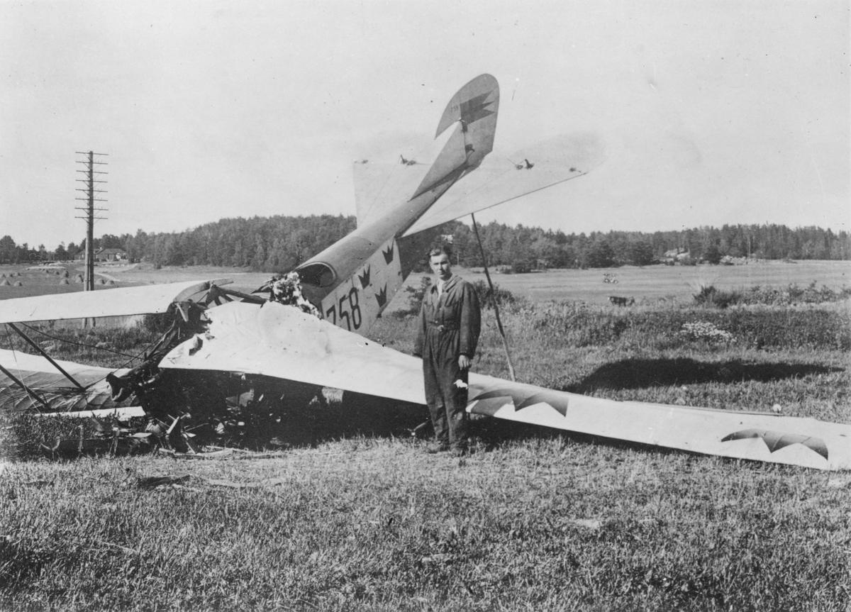 Ett havererat flygplan Albatros NAB 9 nummer 758 tillhörande Flygkompaniet ligger på ett fält. En man står bredvid.