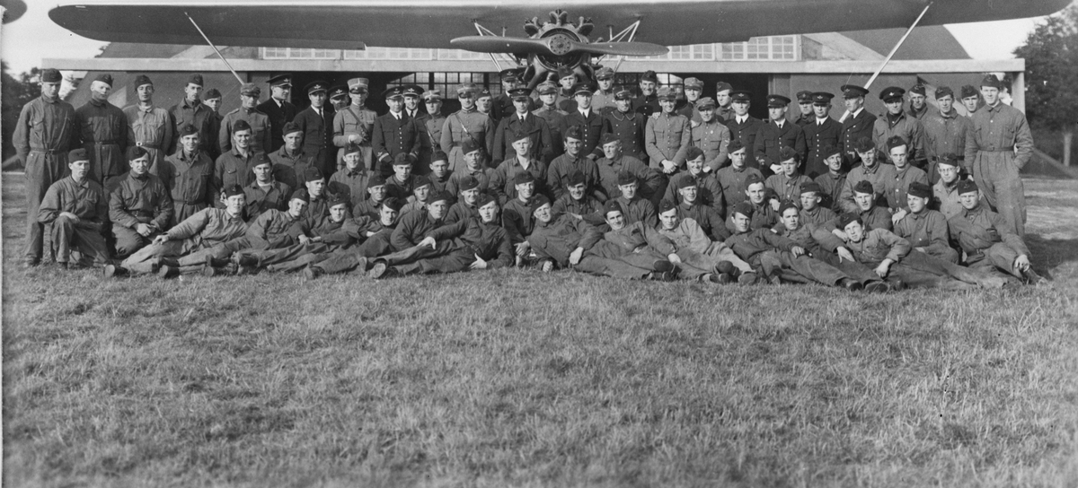 Gruppbild av lärare och flygelever framför flygplan S 6 Fokker vid arméspaningskurs, 1930-tal.