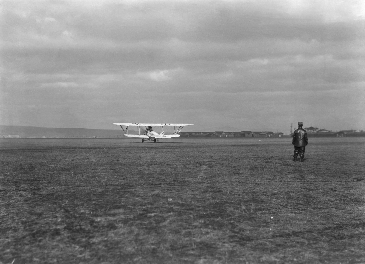 Militärt flygplan av typ Lohner B tillhörande Österrike-Ungern står på ett flygfält. Flygplanet är vitmålat. Hangarer i bakgrunden.