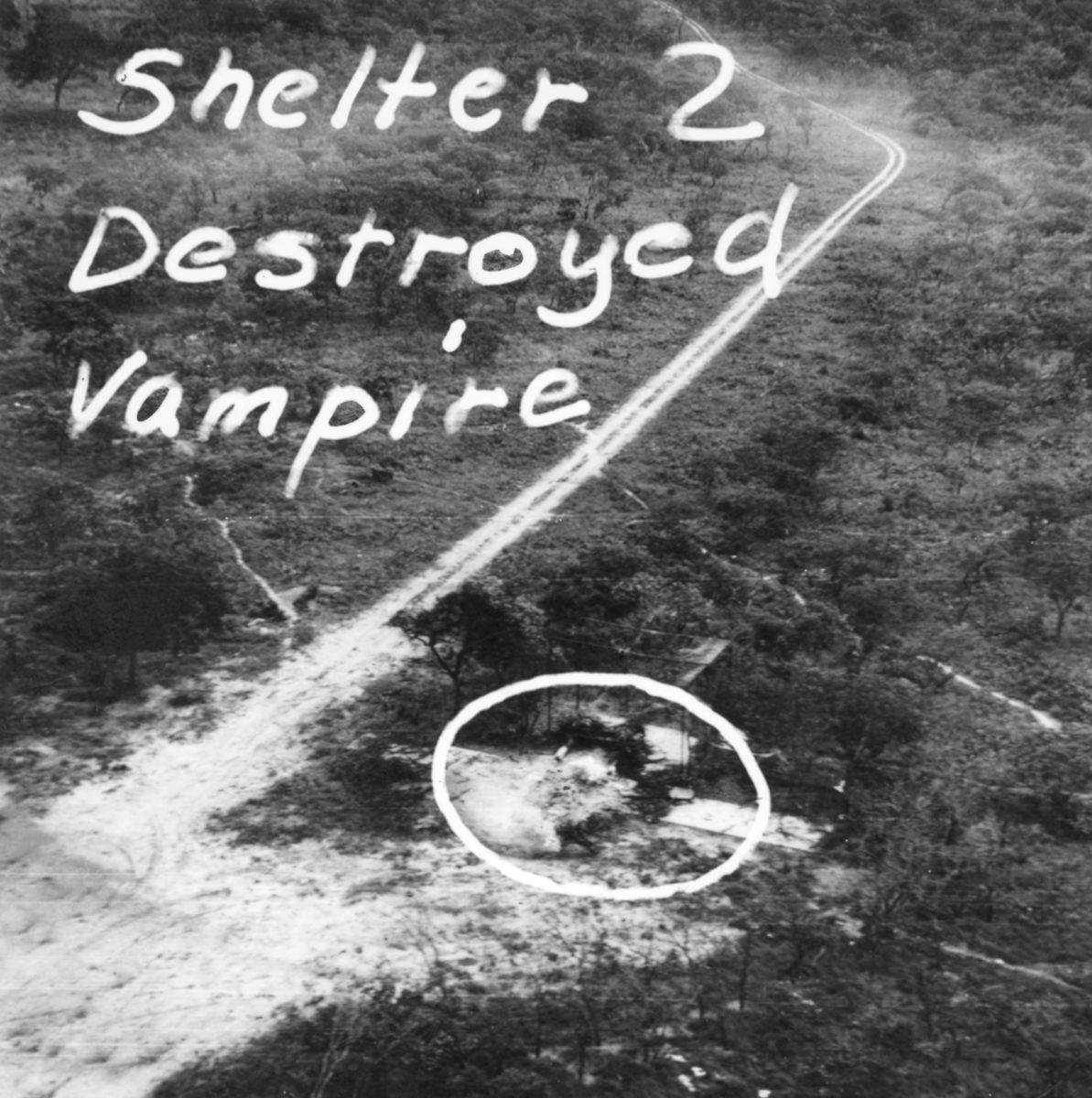 Flygspaningsbild av katangesiskt flygplan De Havilland Vampire vid flygbana. Foto taget efter anfall av F 22 under Kongokrisen, den 29 december 1962. Med påritad spaningsinformation "Shelter 2 Destroyed Vampire".