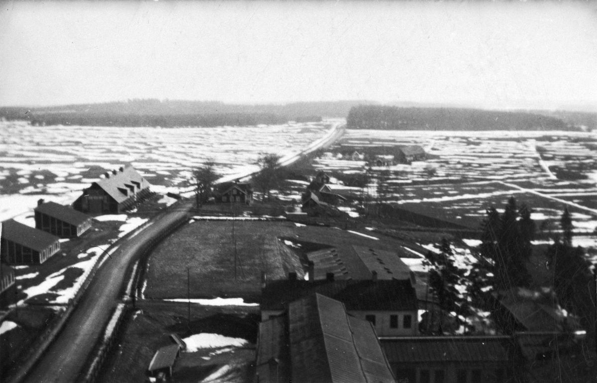 Byggnader vid Centrala flygverkstäderna vid Malmslätt, vintertid, omkring 1930. Foto taget från vattentornet mot öster. Till vänster G-hangarerna och lägerhyddan.