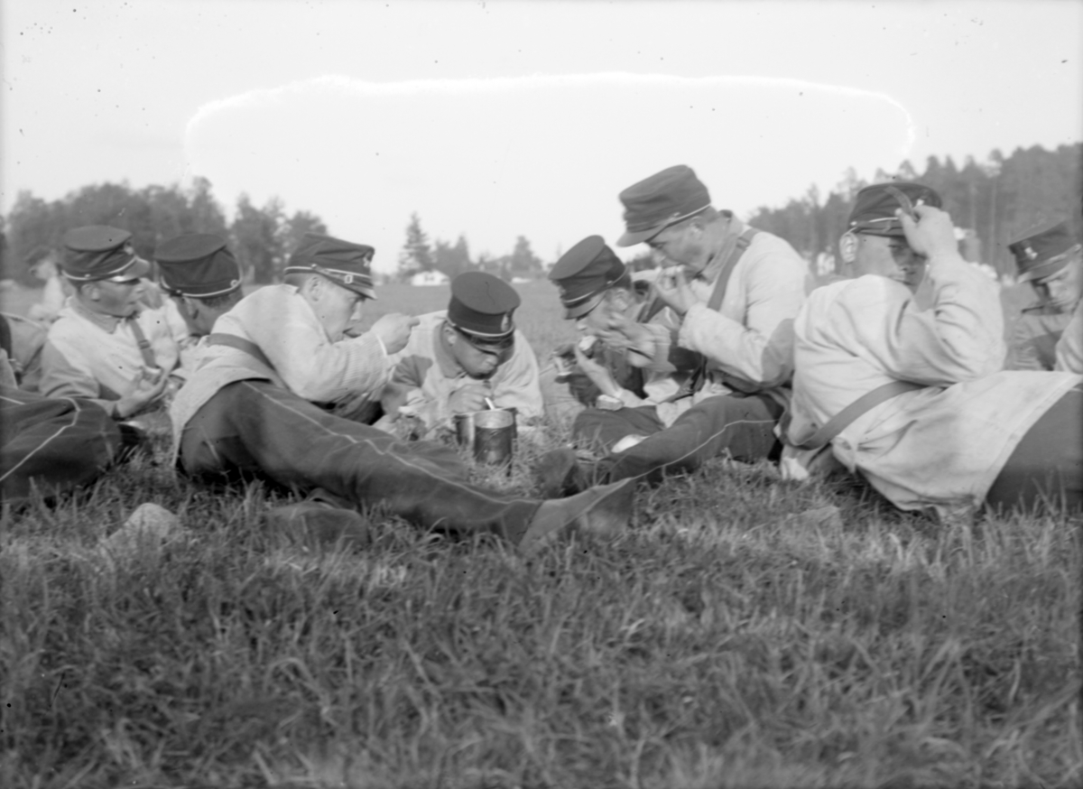 Gruppbild. En samling armésoldater i fält sitter på marken och äter. Soldaterna är antagligen från I 4 och / eller I 5 regemente.