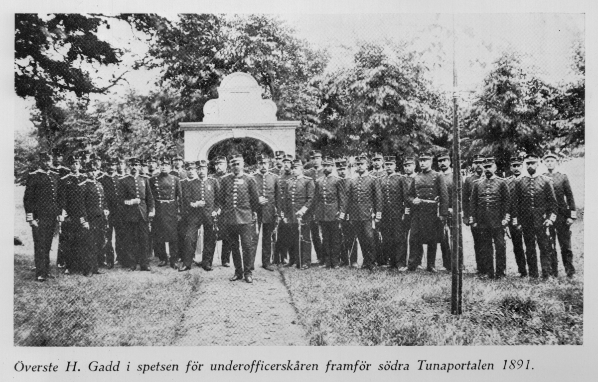 Underofficerskåren på Malmen framför södra Tunaportalen ca 1891. Avfotografering av bild ur tryck.