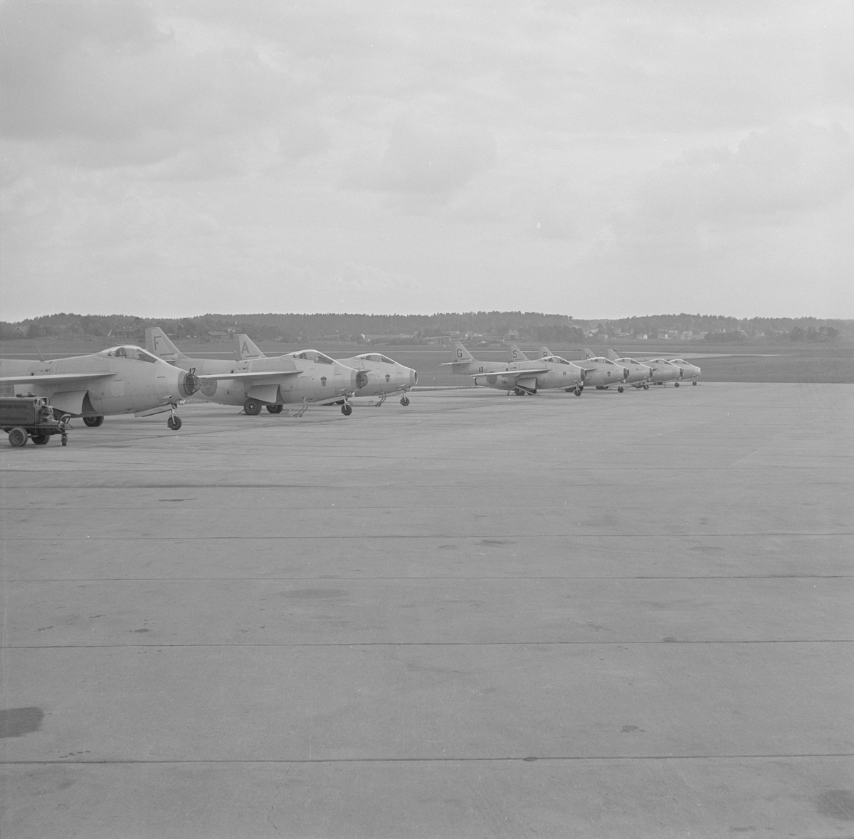 Åtta flygplan Saab 29 Tunnan står på linje på flygfältet på F 8 Barkarby.