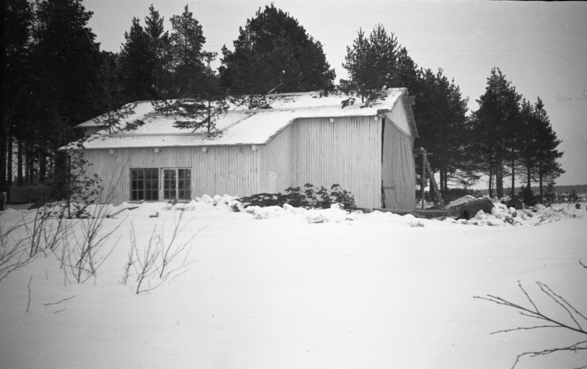 En hangar i ett skogsbryn vid F 19, Svenska frivilligkåren i Finland.