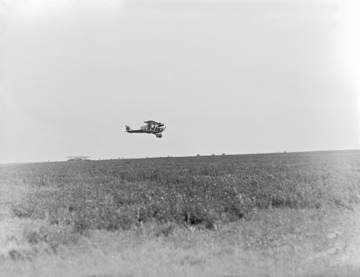 Militärt flygplan Hansa Brandenburg C.I märkt 26.17 tillhörande Österrike-Ungern flyger lågt över flygfält. Vy från sidan.