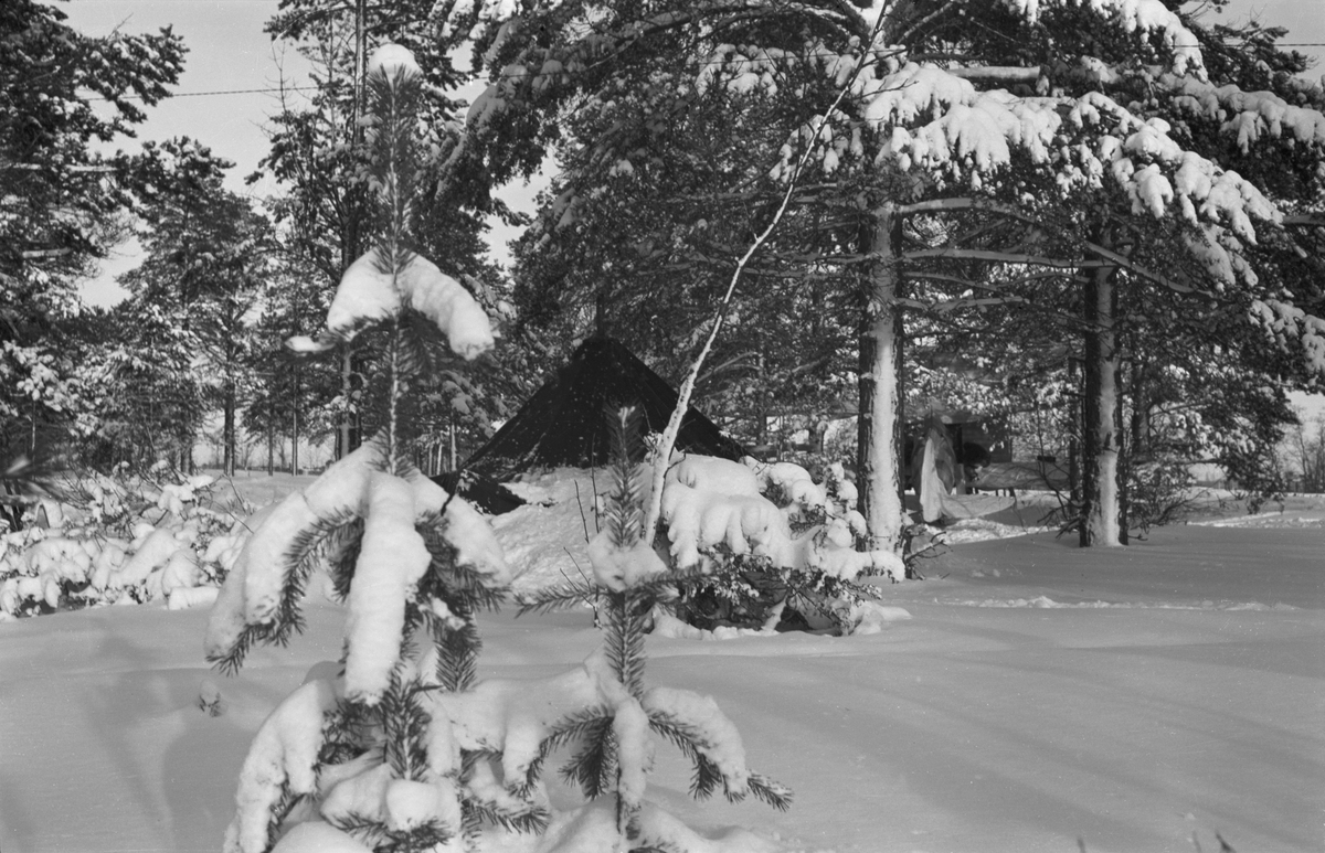 Ett tält i skogen vid Svenska frivilligkåren i Finland, F 19. I förgrunden skymmer två små granar tältet.