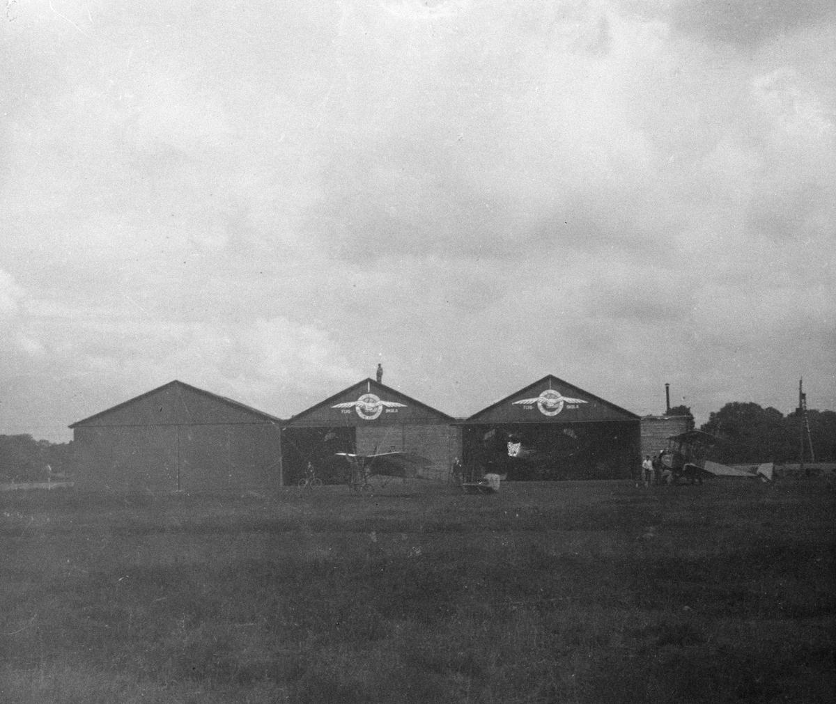 Två flygplan, det ena av typ Thulin E, står på flygfältet framför hangarerna vid Thulins flygskola i Ljungbyhed, omkring 1916. Människor i rörelse kring flygplanet.