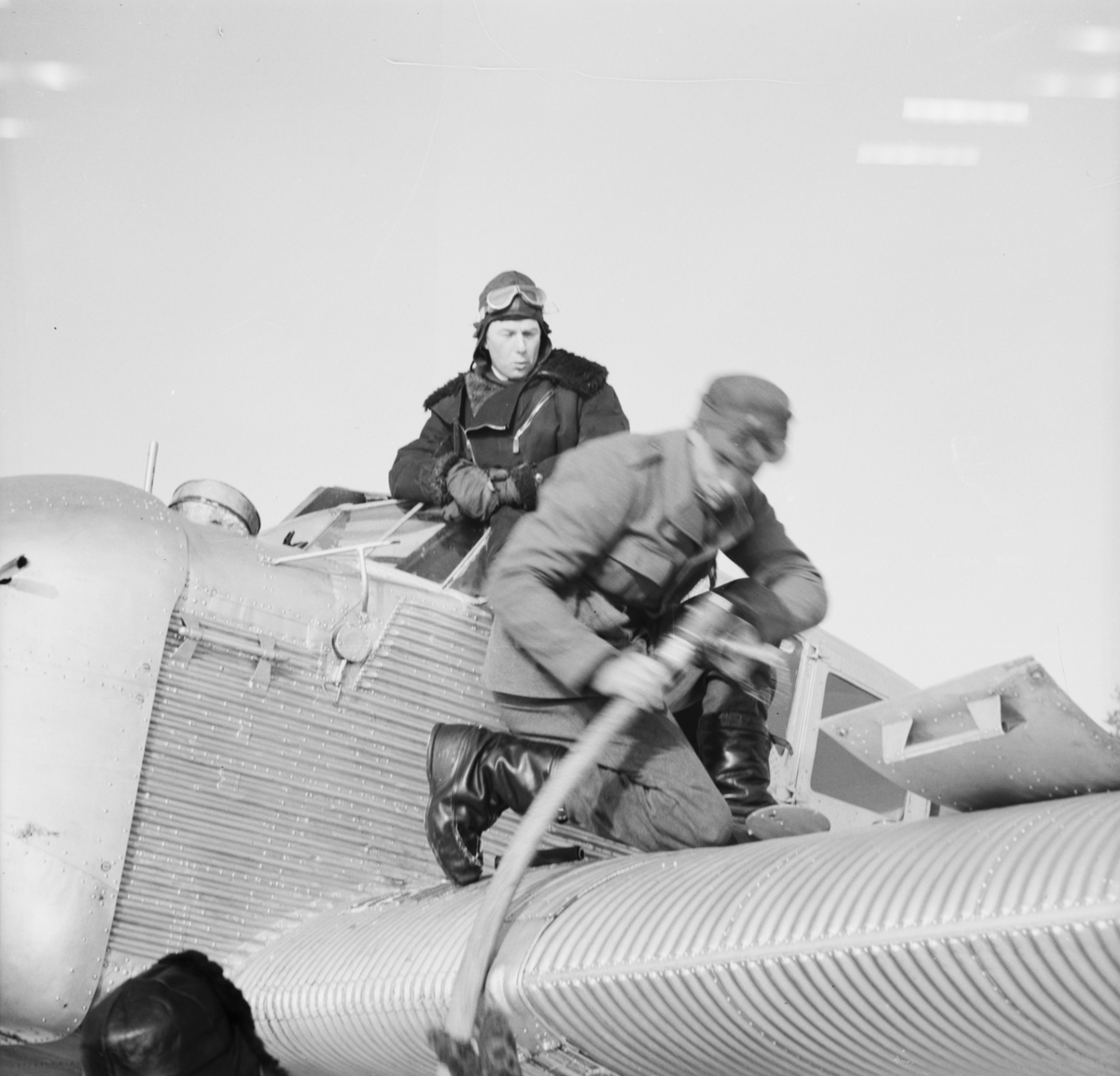 Tankning av flygplan Junkers F-13 OH-SUO vid F 19, Svenska frivilligkåren i Finland. En mekaniker tankar vid vingen. I förarsits står flygförare Björn Bjuggren.