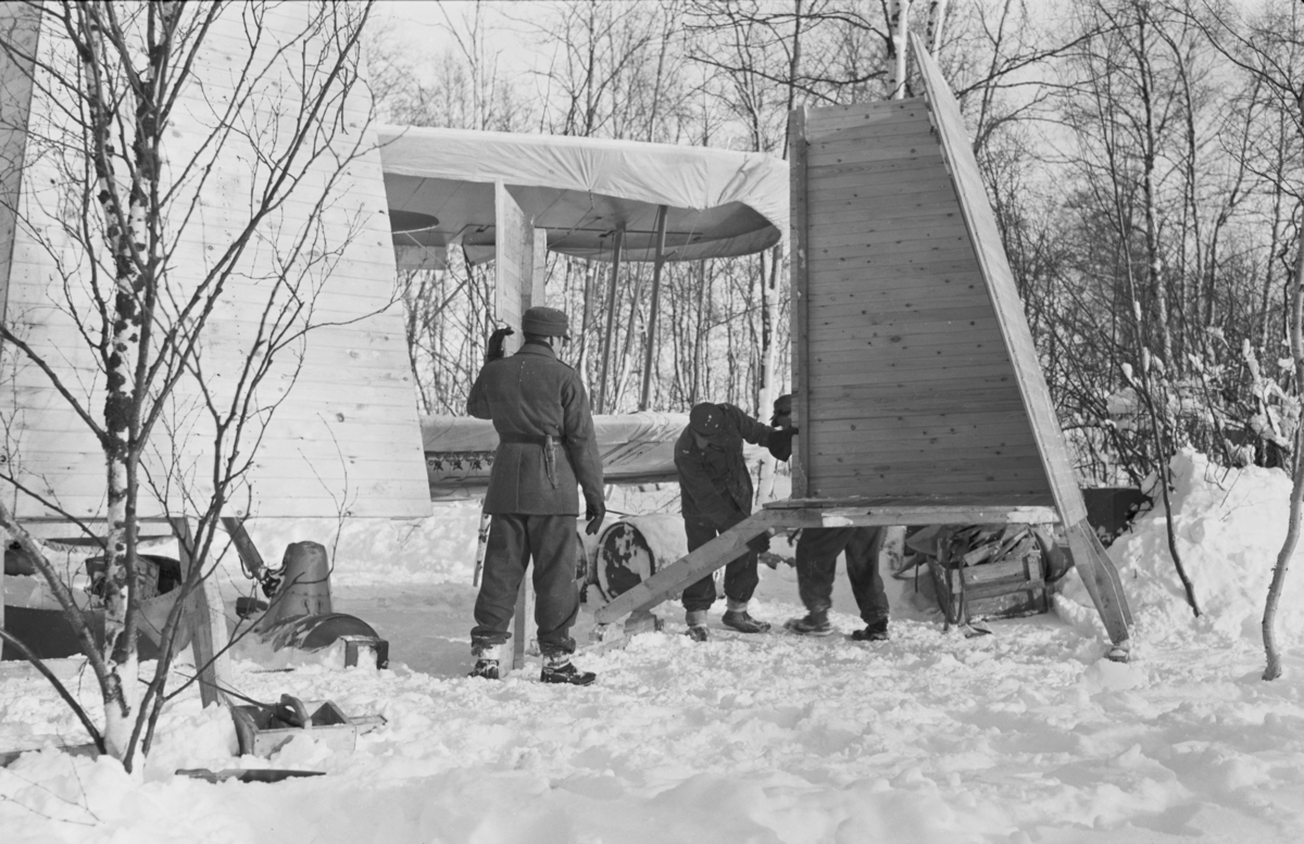 Skyddshus för flygplan drages igen framför flygplan Gloster Gladiator vid F 19, Svenska frivilligkåren i Finland. Tre militärer i arbete.