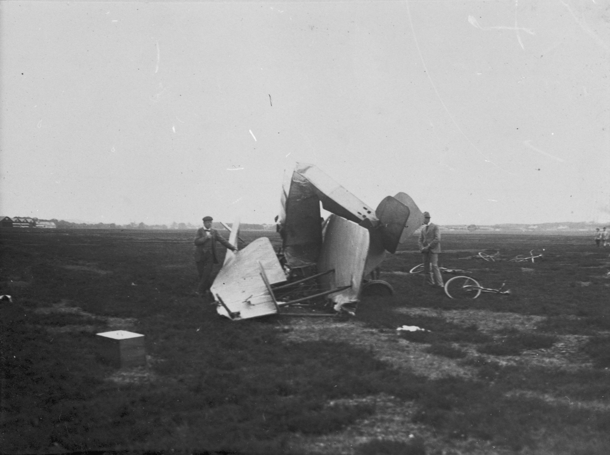 Vraket av flygplan Thulin E efter haveri på flygfältet i Ljungbyhed 20 juni 1919. En man står bredvid flygplanet.
