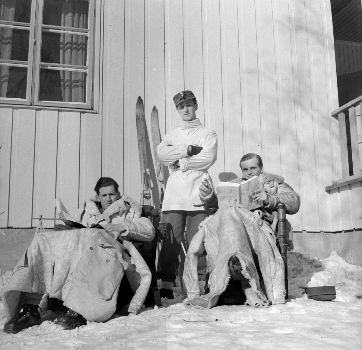 Tre jaktflygare tillhörande F 19, Svenska frivilligkåren i Finland i högsta beredskap framför husvägg. Från vänster: Roland Martin, Ian Iacobi och Martin Wennerström.