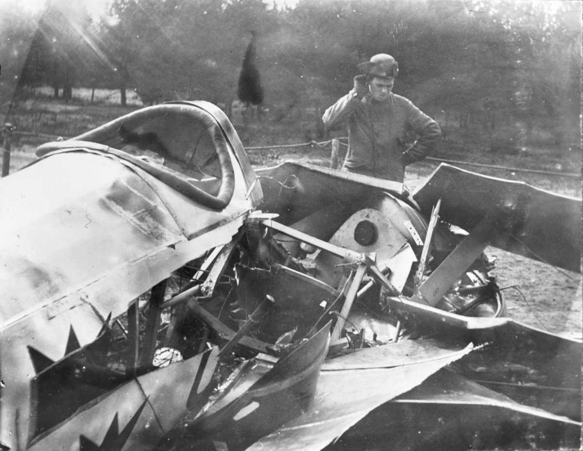 En flygsoldat inspekterar resterna av havererat flygplan på Flygkompaniet på Malmen, 1920-tal.