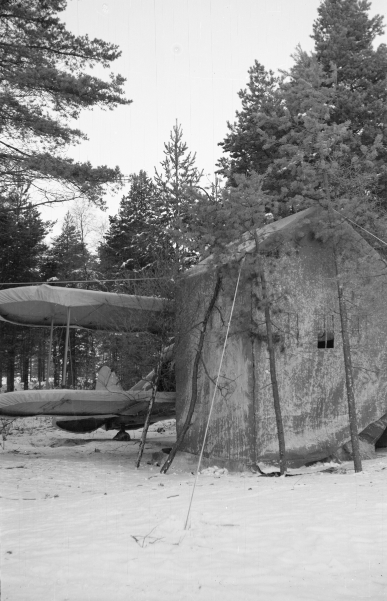Flygplan Gloster Gladiator står i skyddshus vid F 19, Svenska frivilligkåren i Finland.