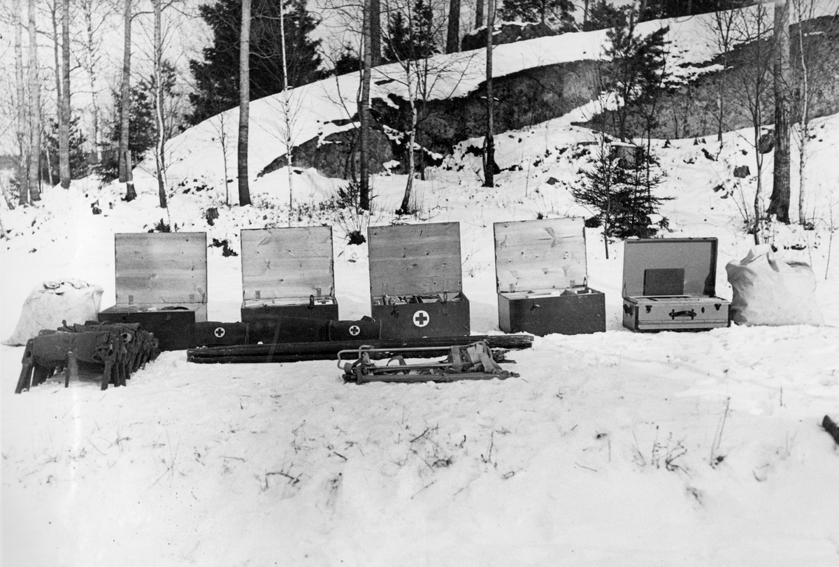 Sjukvårdsutrustning tillhörande sjukvårdsskolan vid F 11 Södermanlands flygflottilj, 1945.
