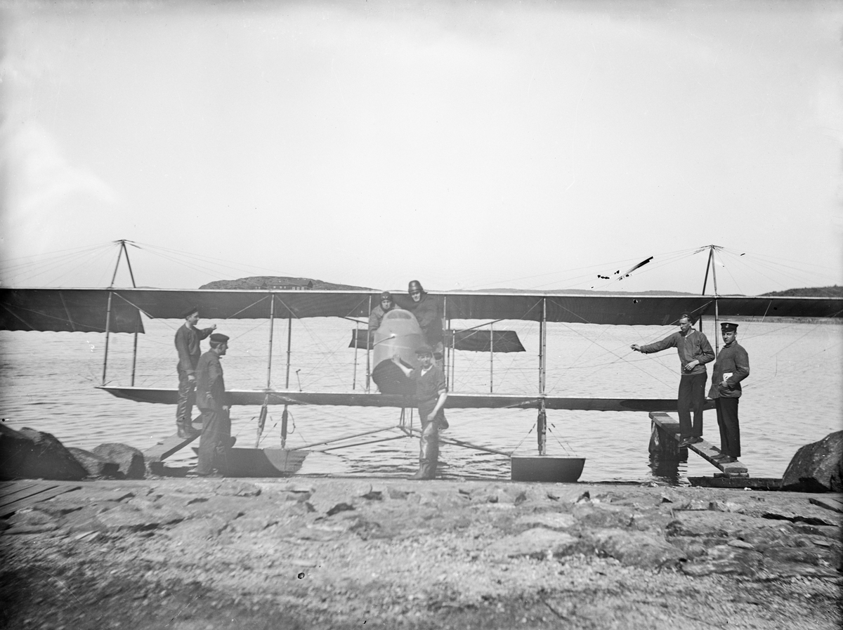 Flygbåt Farman HF 23 / F 1 vid kaj, omkring 1914. Sju militärer vid flygplanet. Originalflygplanet inköpt från Frankrike.