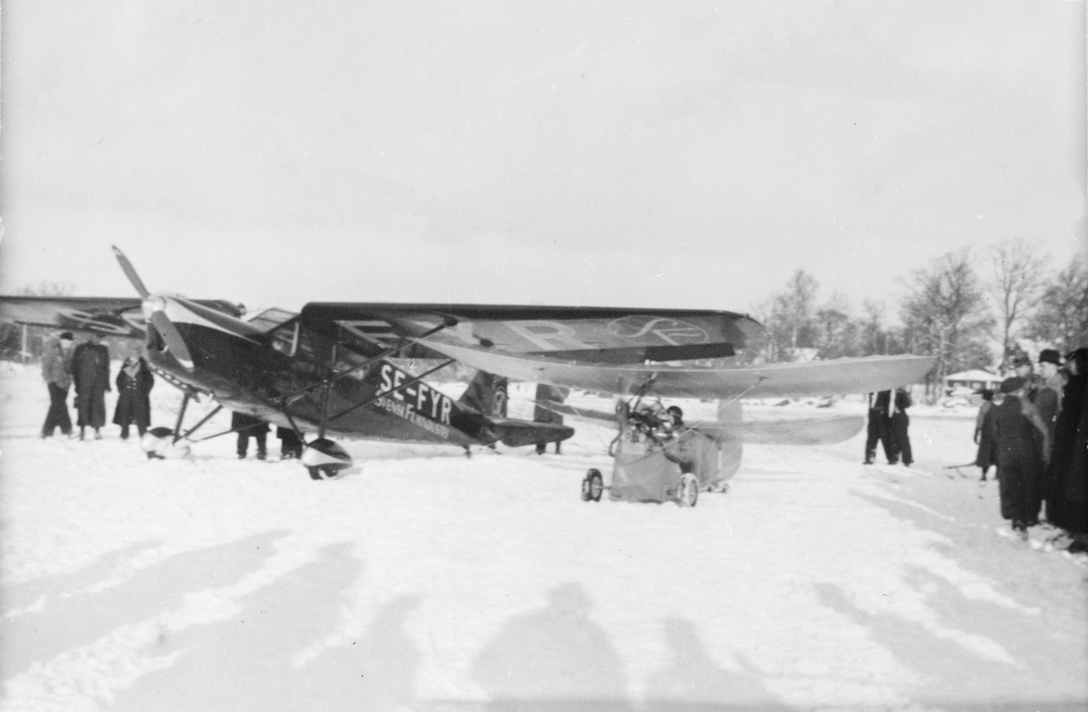 Flygplan ASJA Viking II, med civilregistrering SE-FYR tillhörande Svensk Filmindustri och Stockholmstidningen samt flygplan Flygande Loppan står på ett fält, vintertid, cirka 1935-1941. Folksamling kring flygplanen.