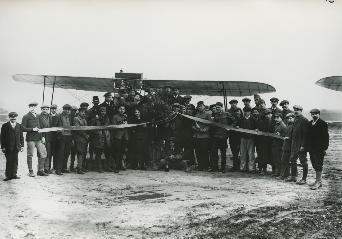 Gruppfoto av större folksamling vid ett flygplan Phönix i Österrike-Ungern under första världskriget. Militärer och civilklädda. Ett band är spänt framför flygplanet och knutet runt Edmund Sparmann, med en växt, i mitten.