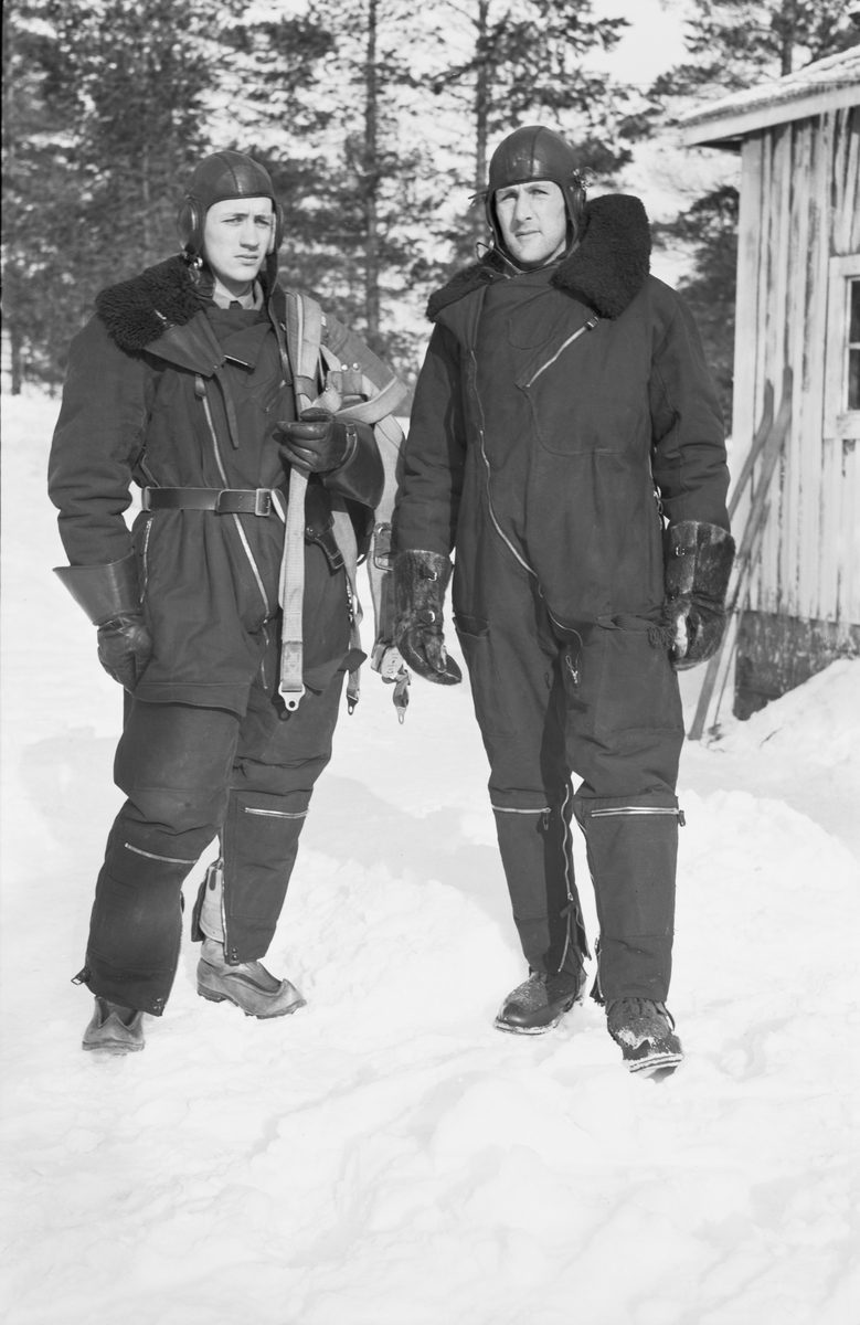 Porträtt av två militärer i flygdräkt vid Svenska frivilligkåren i Finland, F 19. Till vänster Roland Sahlberg och till höger Thord-Erik Torstensson-Medalen; båda flygsignalister.