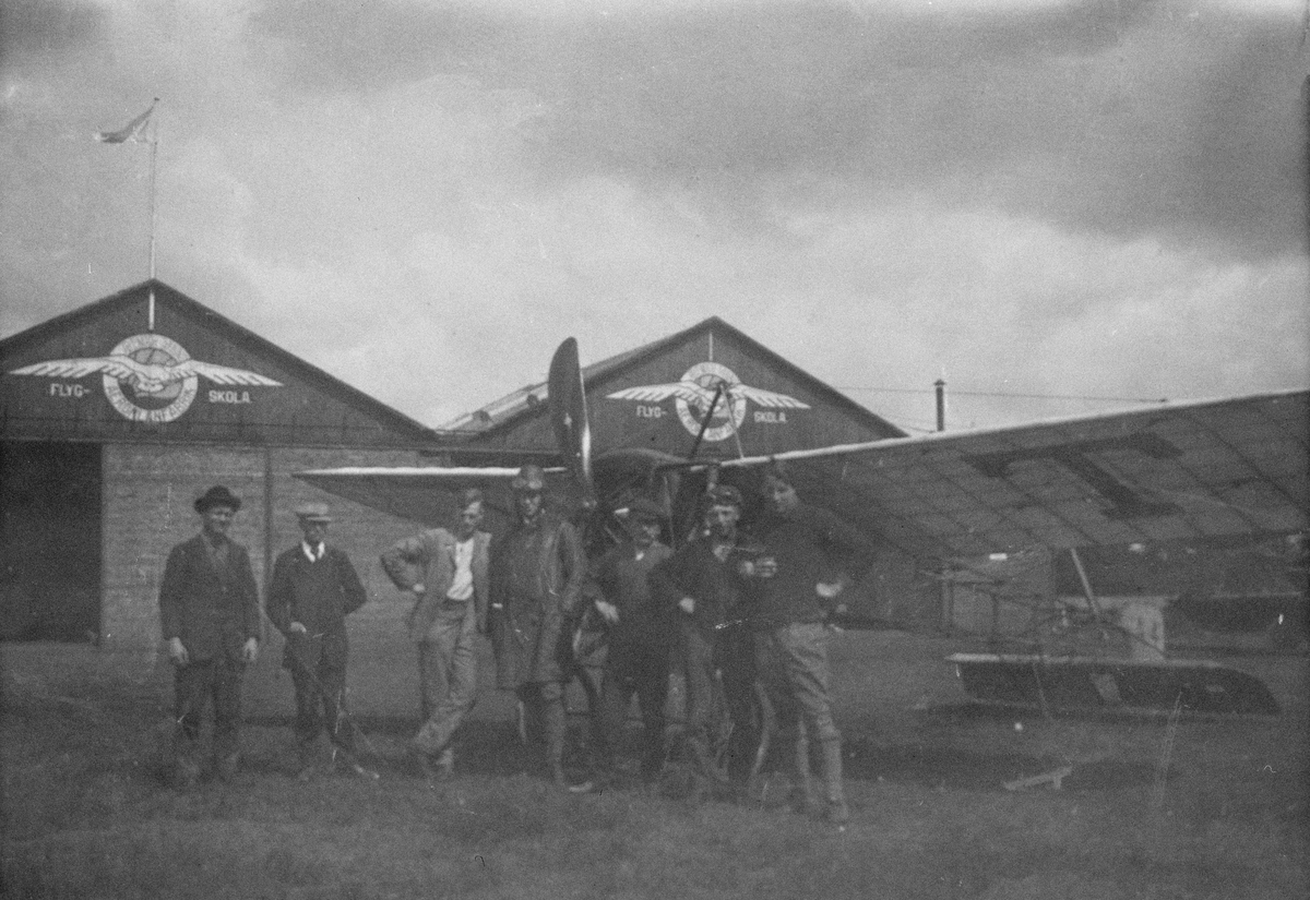 En flygare och personal vid Thulins flygskola står framför flygplan Thulin A, omkring 1915. Sju män. I bakgrunden hangarer.