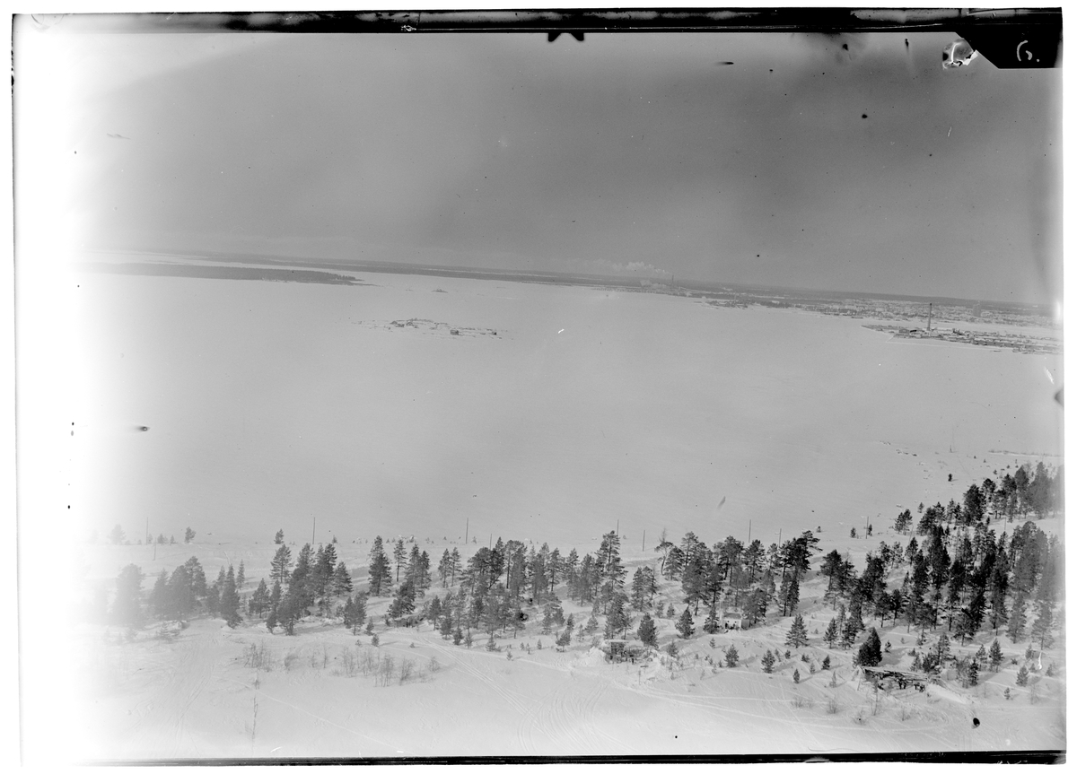 Flygfotografi av del av flygstationen på bakre basen i Veitsiluoto under finska vinterkriget 1940. Från F 19, Svenska frivilligkåren i Finland. I förgrunden syns flygstationen, i bakgrunden syns Veitsiluoto samhälle.
