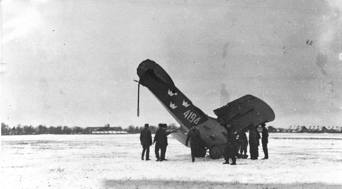Flygplan Phönix C.1, Dront nr 4194 har landat på nosen på Malmen, vintertid, 1927. Militärer runt flygplanet.