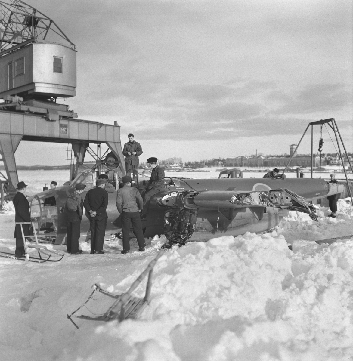 Bärgningsförsök av flygplan B 18 på isen i Härnösands hamn efter flygning i hårt väder i februari 1946. Folksamling och militär personal vid flygplanet. I bakgrunden syns lyftkran. Vy från sidan.