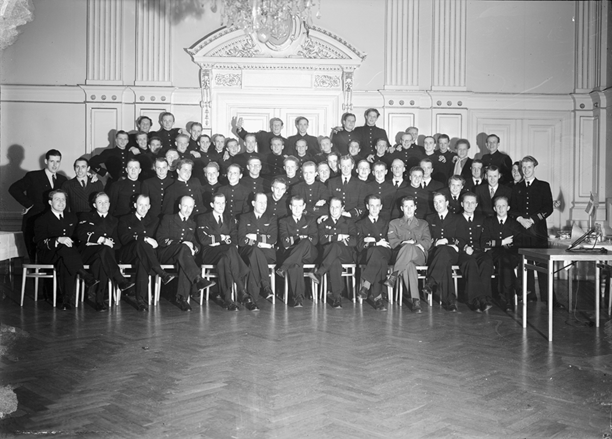 Grupporträtt av personal vid F 2 Roslagens flygflottilj. Omkring 7o män framför dörr i en stor sal