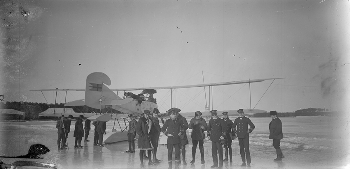 Marinofficerare samlade kring stjärtdelen på ett sjöflygplan vid strandkant på Hägernäs.